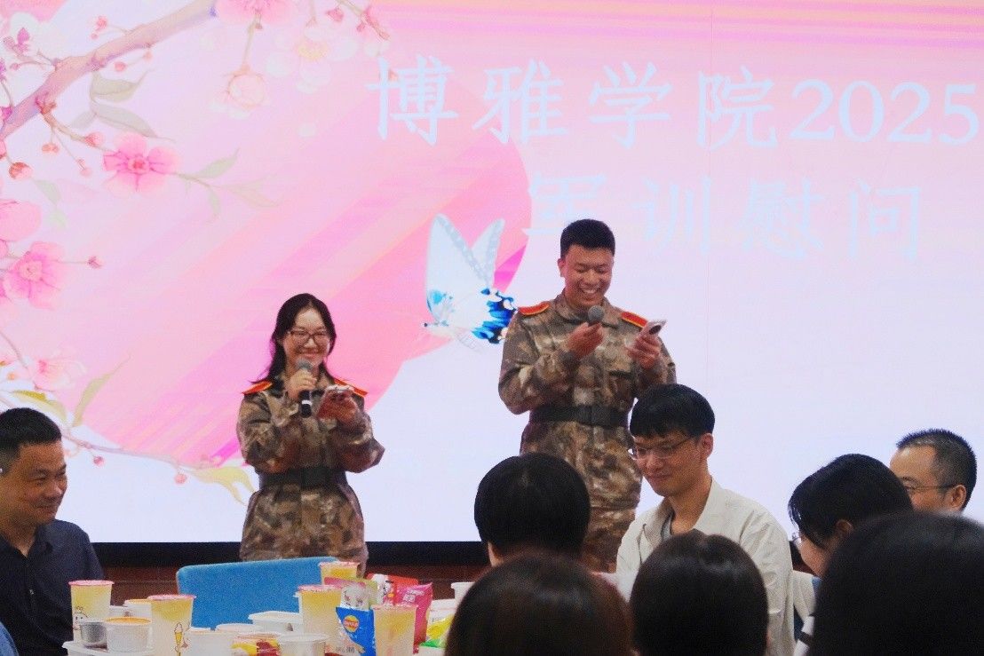 清风送爽,温情满院。9月14日,博雅学院在学院报告厅隆重举行2025级新生军训慰问活动,为正在刻苦参加军事技能训练的新生送去清凉与关怀,勉励他们顺利完成训练任务,促进师生互动交流,丰富军训期间文化生活。学院党委书记孙江林、党委副书记姜雪峰、副院长李广益、副院长唐杰、2025级班主任及辅导员朱家常等出席活动,与全体新生共同参与了本次慰问交流。