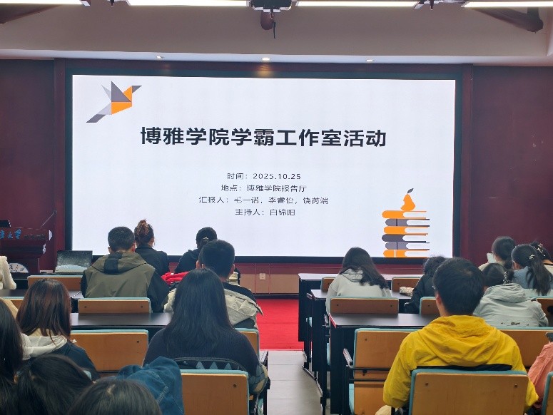 2025年10月25日晚,博雅学院“学霸工作室”第二期活动于学院报告厅成功举行。本期活动聚焦“专业课程学习”、“升学保研”与“学科竞赛”三大主题,特邀本院大二至大四年级的饶芮端、李睿怡、毛一诺三位优秀学生进行经验分享,吸引了各年级同学积极参与。