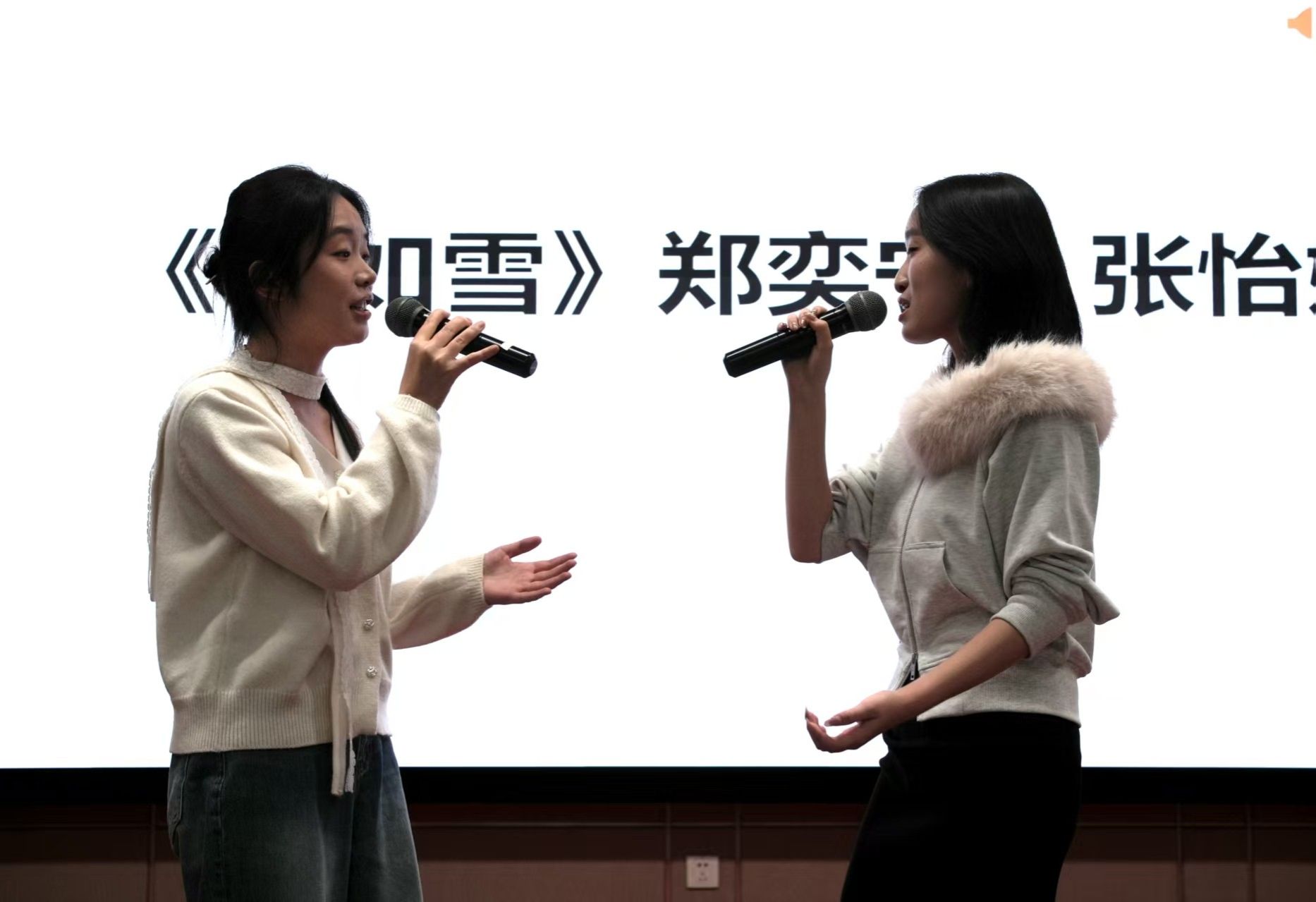 随后的雅趣互动环节中,郑奕宁与张怡姗同学联袂献唱《发如雪》,婉转歌声搭配古风旋律,点燃全场氛围,同学们纷纷打开闪光灯随着音乐的节奏挥舞。