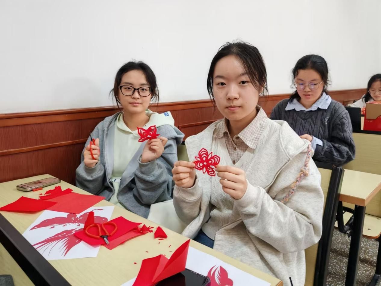 理论讲解结束后,活动进入核心的剪纸手作实践环节。同学们手持剪刀、铺展红纸,在徐老师的悉心指导下,从构图构思、纸张折叠,到精细雕刻、修边整形,一步步投入到古风剪纸耳饰的制作中。指尖翻飞间,剪刀在红纸上游走,原本普通的纸张,经过同学们的巧思与巧手,逐渐化作带有传统纹样的精巧耳饰——既有非遗剪纸的古朴雅致,又融入了青年学子的创意巧思,实现了传统美学与青春活力的完美融合。