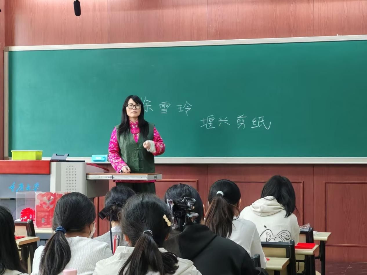 活动伊始,徐雪玲老师结合自身多年剪纸实践经验,以通俗易懂的语言、生动鲜活的案例,为同学们系统讲解了剪纸艺术的悠久历史与文化内涵,重点介绍了“堰兴剪纸”的风格特质、创作理念及基础技法。从剪纸工具的选择、纸张的折叠技巧,到纹样的设计思路、裁剪的力度把控,徐老师讲解细致入微、深入浅出,让在场学子对剪纸艺术有了全面且深刻的认知。